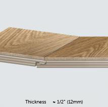 Engineered floor 12 mm (≈1/2ʺ) thick and composed of a 3mm (≈1/8ʺ) hardwood top layer on 9mm (≈3/8ʺ) Baltic Birch plywood comprising 7 layers with self-locking joints for quick installation.* Random board lengths up to 7' for a more natural look.